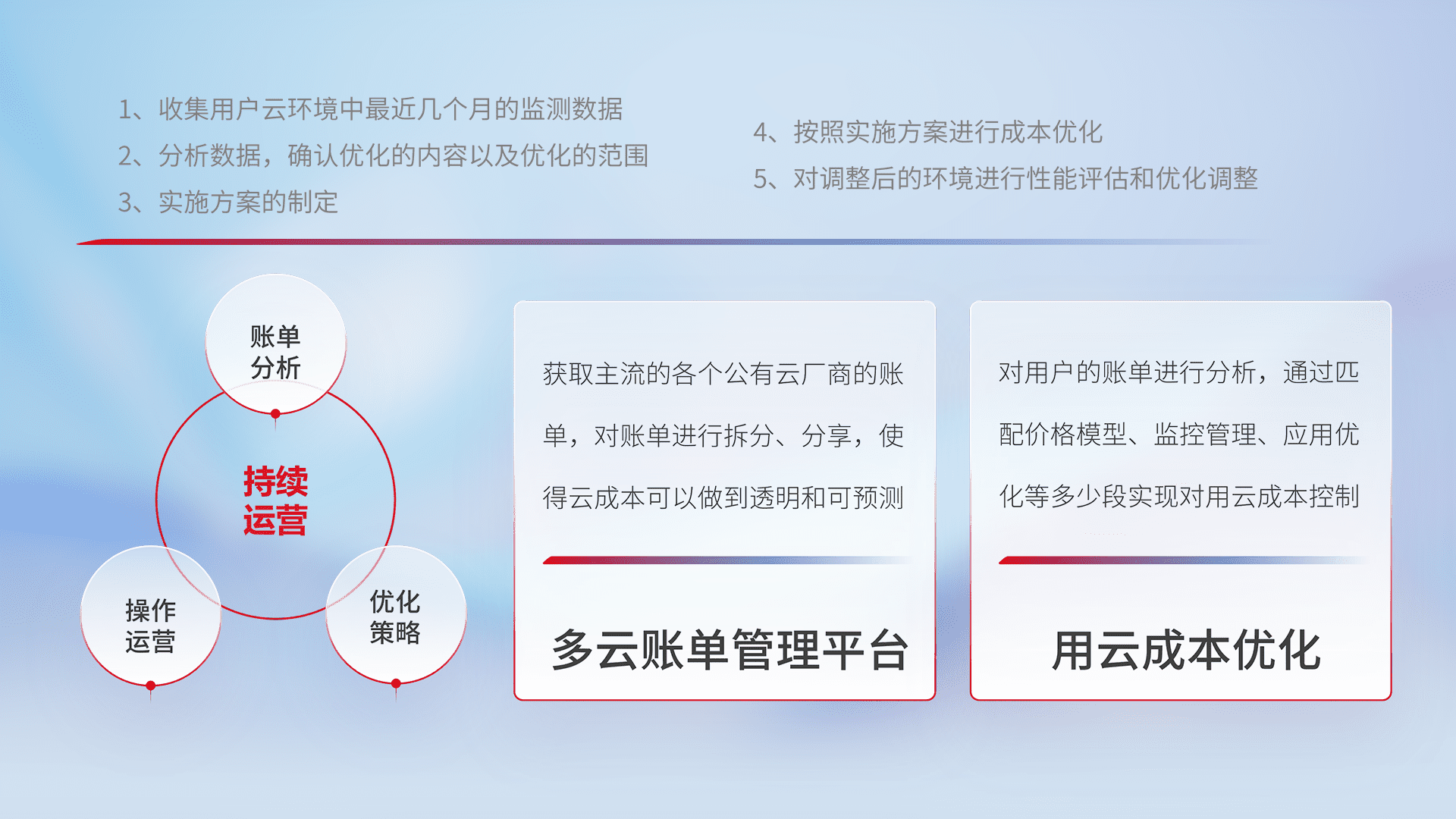 通过灵活运用多种自动化迁移工具,,帮助企业用户实现业务和数据高效 、、、、稳定的上云迁移和云上迁移,,,,采用自研多云纳管平台,,,,以中立管理模式,,解决多组织、、多云、、多运维厂商的复杂关系的管理,,,保证多云平台资源配置的一致性,,,实时掌控云资源运行数据,,,,运用智能化工具分析云资源多云平台的管理服务,,,透明化管理成本支出,,,用云成本可预测、、、用云费用可优化、、、云资源配额有据可依。。