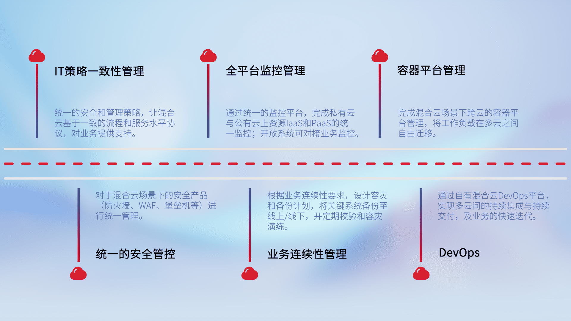 通过多云纳管,,以统一的资源数据模型把客户的云资源进行抽象和封装,,,进而实现对多云资源的统一操作,,保障云资源管理的可靠性、、稳定性与可用性。。。量身定制化运维内容,,,配置、、、开发运维、、、补丁管理、、、备份、、、、监控、、、认证和访问管理、、、审计和日常巡检等,,,保障在用云过程中的可靠度,,,,稳定度以及高可用率。。。